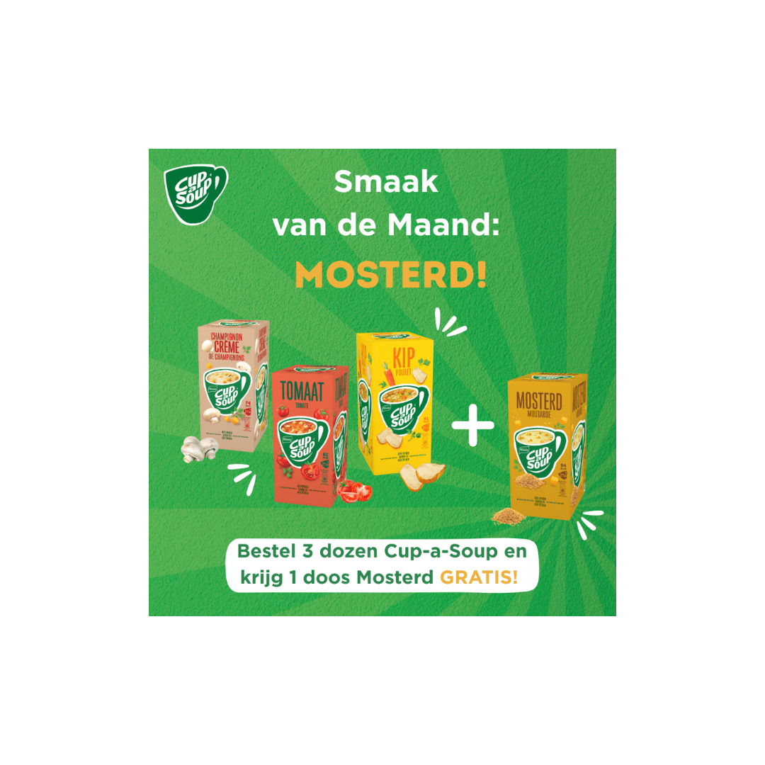 Bij aankoop van drie omdozen Cup-a-Soup catering ontvang je nu één GRATIS omdoos Cup-a-Soup Mosterd.